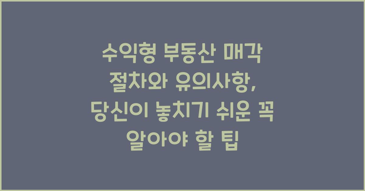 부동산 매각, 특히 수익형 부동산을 매각할 때는 많은 고민과 주의가 필요합니다. 제가 경험한 바에 따르면, 매각 실패나 예상보다 낮은 수익으로 이어지기도 하죠. 이 글에서는 수익형 부동산 매각 절차와 유의사항에 대한 주요 정보를 함께 나눠보려 합니다. 올바른 절차를 이해하고 주의점을 숙지함으로써 여러분의 부동산 거래가 한층 더 원활해질 것입니다.